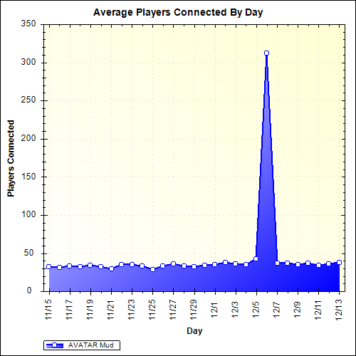 Avatar. Created by a man who has spawned what is now this 6th Ubercon... and his mud isn't even in the top 20 right now, nor ever in the top 10 or 15 for years. Page two news. A long time ago, this mud ranked #1 often. But now, long-awaited Legend code was finally put in after years of being overdue, just to be broken and pulled out immediately, which is sad, because all other development is gone by the wayside, and there's so many things that desperately need fixing, and the new Legends have nothing to do but waste away. Average counts are far below one hundred - usually 70ish - and only peak above that when multiplayer is turned on during hogs. Some say these are the dedicated people who don't want to leave. At least though we don't claim 500 people online at all times when really half or most of them are AFK *sideglance Aardwolf*. People are made Imms when you cannot figure out the slightest logical reason why, since they aren't very effective like they used to be (most of the GOOD ones are gone). Sigh. This mud has lost its vast popularity and just doesn't seem to get it back - because nobody demonstrates it, or seems to want to.