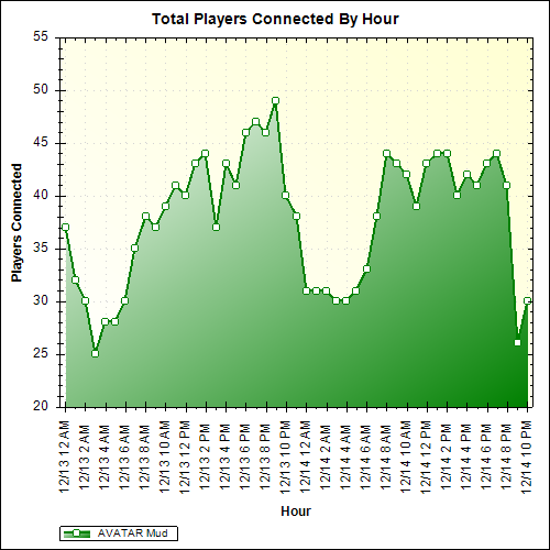 Avatar is the most dynamic, sophisticated, and complex "World" I've ever had the pleasure of sojourning in. Just when I think I've figured everything out, some aspect of the game is enhanced and I have to adjust the way I think (and play) to accommodate the new paradigm (DOH!, Kinda like real life, only with swords, bloody companions, big hairy monsters, and enough mortal / IMMortal surprises to keep me on the edge of my keyboard!). We normally have well over 100 players at any given time, and this rowdy and adventuresome bunch is quietly thrilled with the breadth of game variety, stability, and hack 'n slash fun. Just recently we've had a vocal few (who characterize themselves as the Voice Of The Masses, and representative of the entire player base) who are disenchanted (ewww, bad pun) with some changes in game mechanics. In point of fact, the changes range from bug fixes to integral game-balance modifications that are beneficial and admittedly challenging, AND these players merely represent a fractional faction that invariably wail when change (and yes, Virginia.. ALL change is painful if you've become so ingrained (indoctrinated? brain-washed?) that you've lost any degree of flexibility or appreciation for the challenge of the game) occurs. So, c'mon over to Avatar and see what all the hubbub is about! Get lost in our 12,716 rooms, fight our 5,393 mobs, join a group or solo a bit and form your own opinions. I guarantee you this: you will NOT have to worry about falling asleep from boredom.